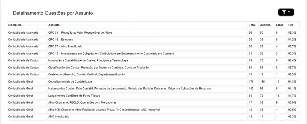 Parte fundamental dentro do estudo para concursos públicos é a análise de seus pontos fracos e pontos fortes. Por este motivo o o Método Phibo possui uma ferramenta que permite analisar qual é seu desempenho em cada tópico de todas as disciplinas que compõem seu ciclo de estudos. Através deste processo o Prof. Igor Cintra conseguirá criar metas adicionais de acordo com suas deficiências, sendo fundamental para que você otimize sua preparação.
